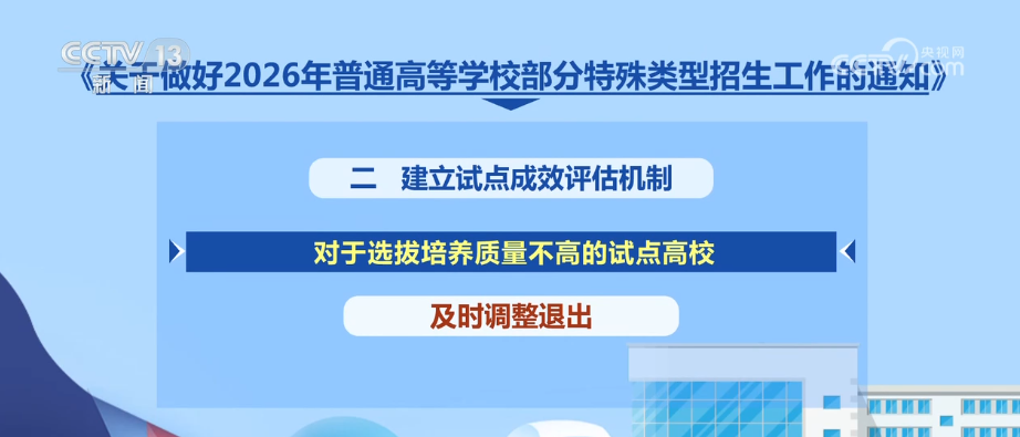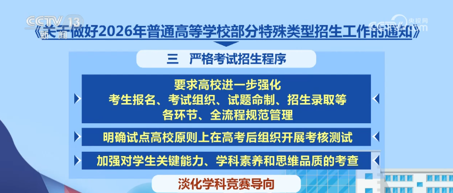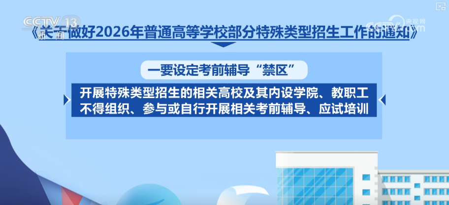 央視網(wǎng)消息:日前,教育部印發(fā)《通知》,部署做好2026年普通高校部分特殊類型招生工作。普通高校特殊類型招生主要包括藝術(shù)類專業(yè)招生、高水平運動隊招生、保送生、綜合評價招生4類。